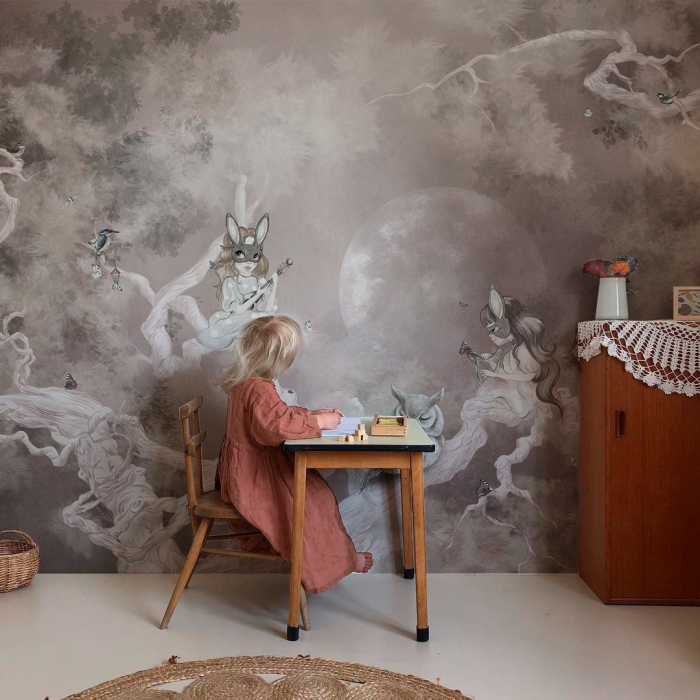 fototapet „Ballade” este o alegere rafinată pentru amenajarea unei camere de copil cu un aer artistic și poetic. Inspirat din pictură în acuarelă, acest decor mural surprinde personaje delicate și animăluțe într-o scenă nocturnă de basm, unde luna, pădurea și elementele fantastice creează o atmosferă calmă și visătoare. Este ideal pentru copii, dar suficient de elegant pentru a completa un decor contemporan atent gândit.