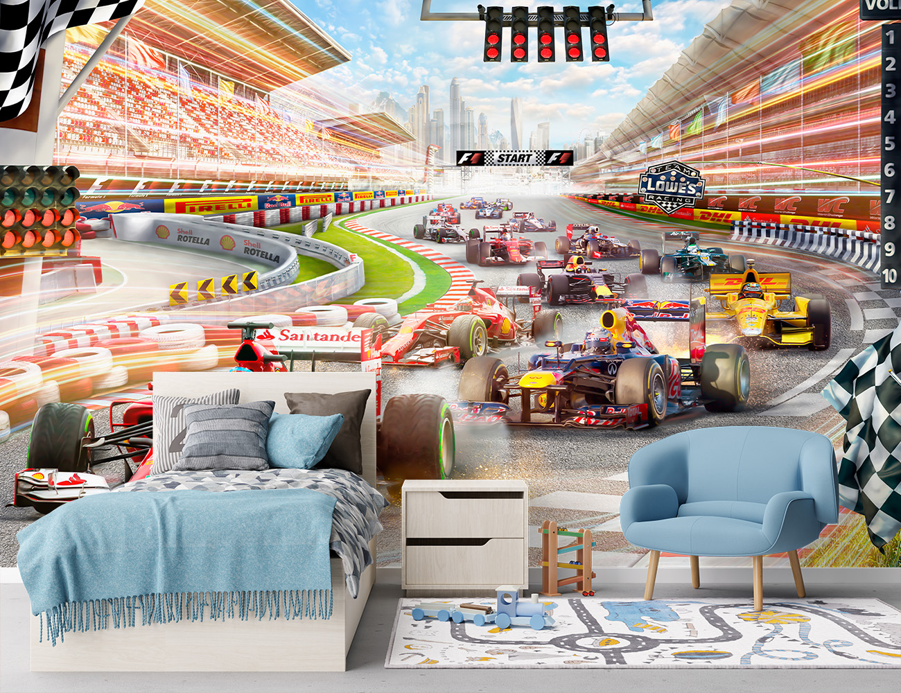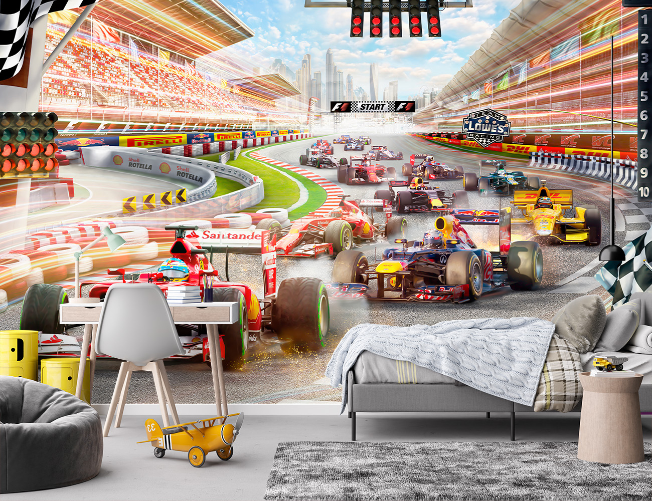 Fototapetul „Racing Champions” este alegerea perfectă pentru pasionații de mașini, curse și adrenalină, ideal atât pentru camera copilului, cât și pentru camera băiatului sau chiar pentru un living modern. Inspirat din atmosfera spectaculoasă a competițiilor Formula 1 (F1), acest design dinamic transformă peretele într-un circuit real, plin de lumină, viteză și energie. Este o opțiune excelentă pentru cei care caută fototapet dormitor, fototapet living sau un decor vibrant care să aducă acțiunea direct în casă.