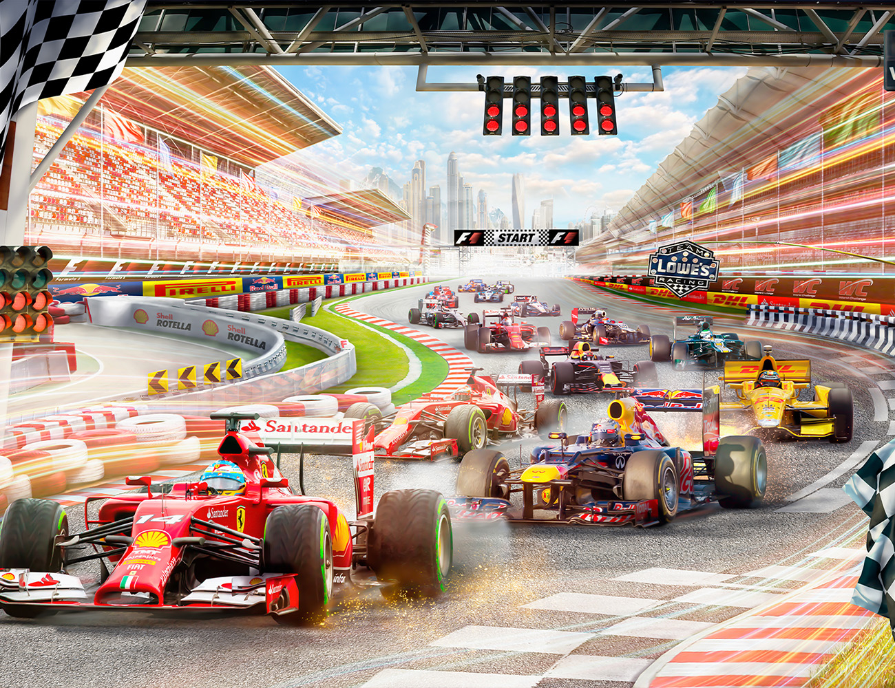 Imaginea redă momentul de start pe un circuit profesionist, cu monoposturi F1 în culori puternice, tribune pline și efecte vizuale care creează un tapet imersiv cu un autentic efect 3D. Totul este realizat în detaliu pentru a oferi o experiență vizuală unică, ideală pentru un accent de design modern sau un element vizual atrăgător într-o încăpere contemporană. Culoarea intensă și mișcarea captată fac acest model potrivit atât pentru tineri, cât și pentru adulți pasionați de motorsport.