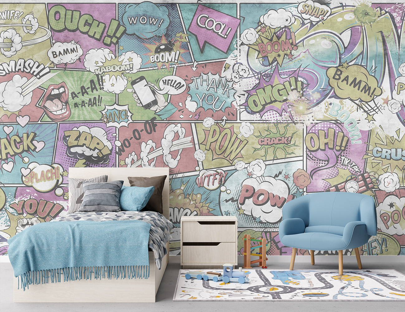 Acest fototapet este conceput pentru a oferi o experiență vizuală unică, fiind ideal pentru cei pasionați de design interior contemporan și decorare perete cu stil urban. Fie că îl alegi pentru tapet living, tapet dormitor sau chiar fototapet bucatarie, modelul „Pop Art” aduce un plus de originalitate și creativitate în orice ambient. Este potrivit inclusiv pentru spații comerciale sau camere de adolescenți, datorită stilului său expresiv și modern.